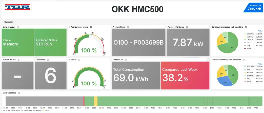 By using clean contacts and sensors equipped with a clamp meter, it was possible to directly measure the energy consumption of the machinery. To ensure even more detailed and responsive management, Zerynth provided the dashboarding tool integrated into the Zerynth platform. This allowed the development of customised dashboards, configured to meet TGR’s specific needs, enabling the immediate and comprehensible display of machinery status, work cycles and energy consumption.
