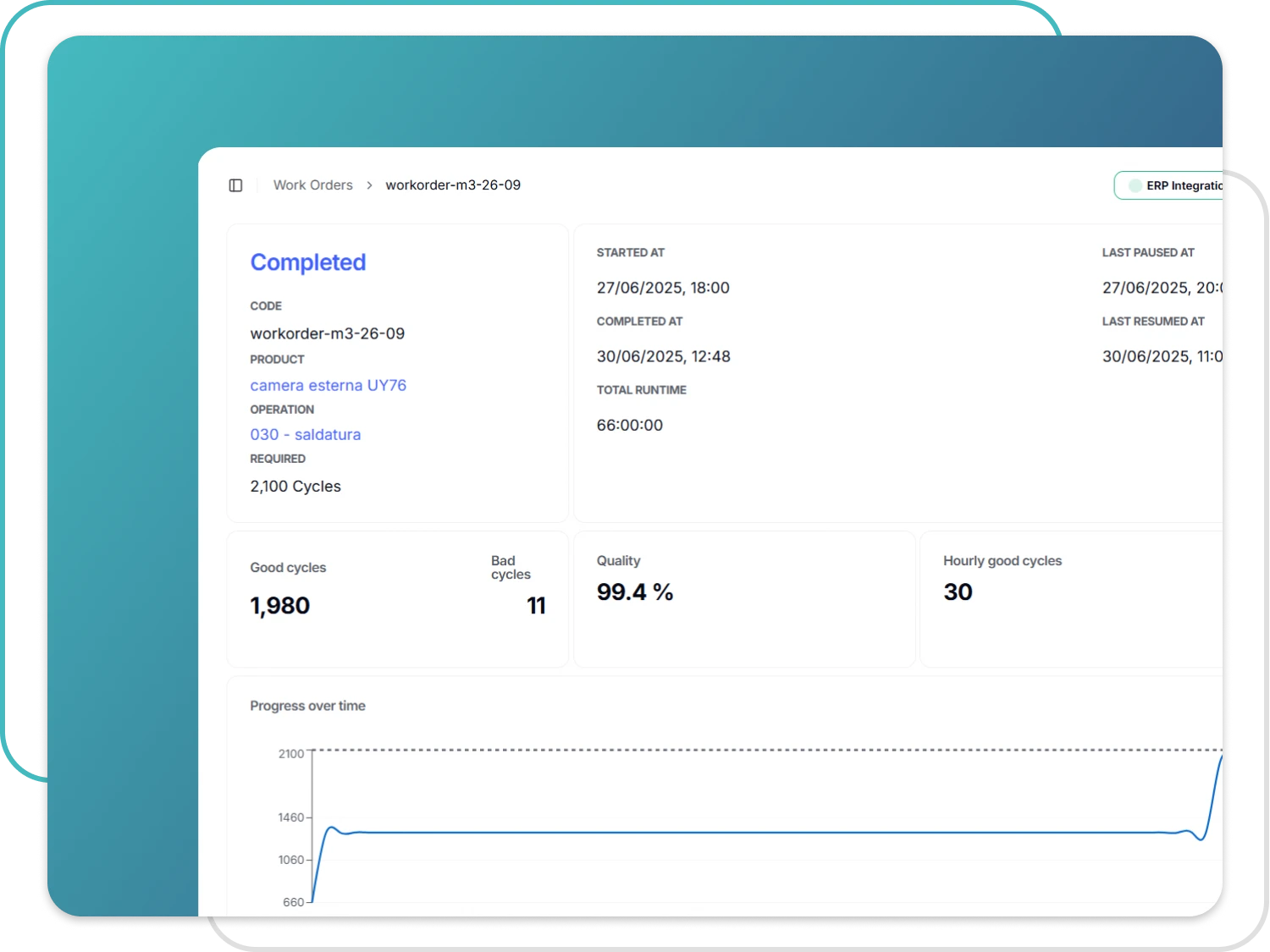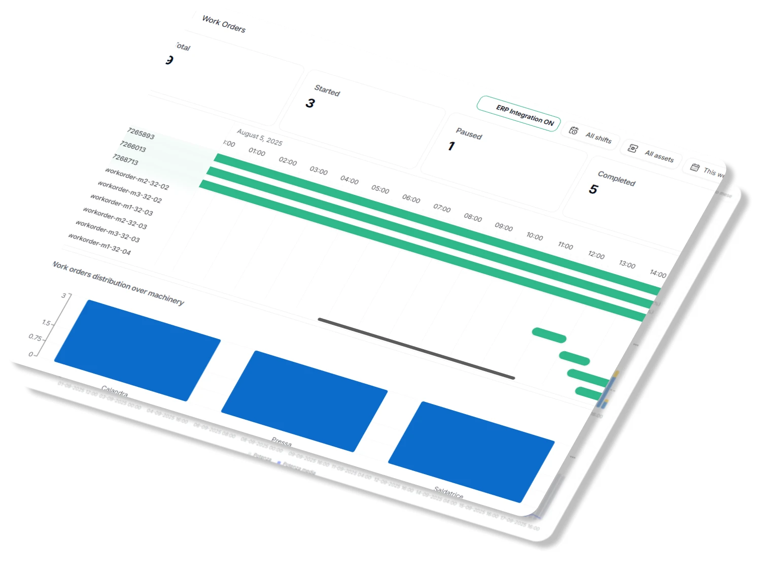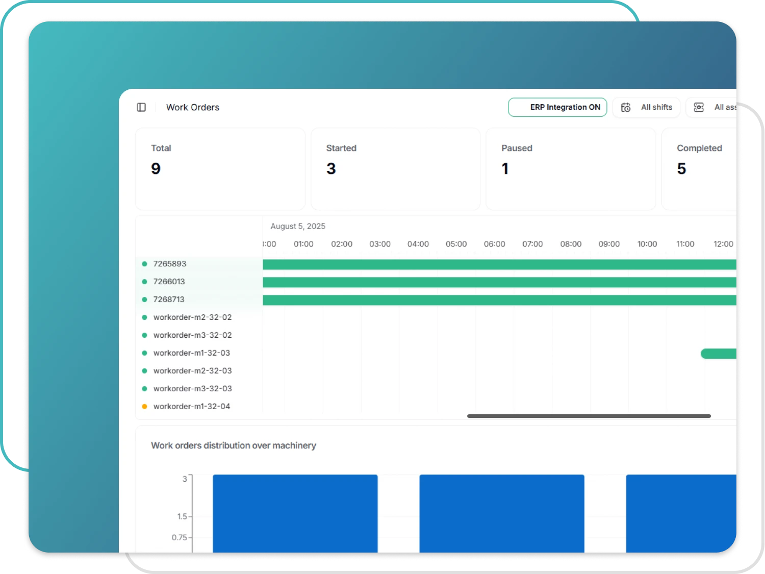 Work Orders Management leverages AI to connect the shop floor with management systems, providing a single, up-to-date view of order status, production progress, and sustainability KPIs. Designed for immediate value without lengthy integration projects, it can be scaled and extended based on your priorities.